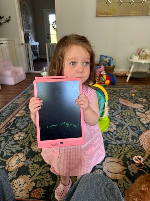 My granddaughter, Lenna Kate, just turned three. She attempted to write me something the other day. Below is a pic of her effort. I have no idea what words she meant to say. But I have am virtually certain that she wrote them, as much as a three-year-old could, with passion and truth in mind.