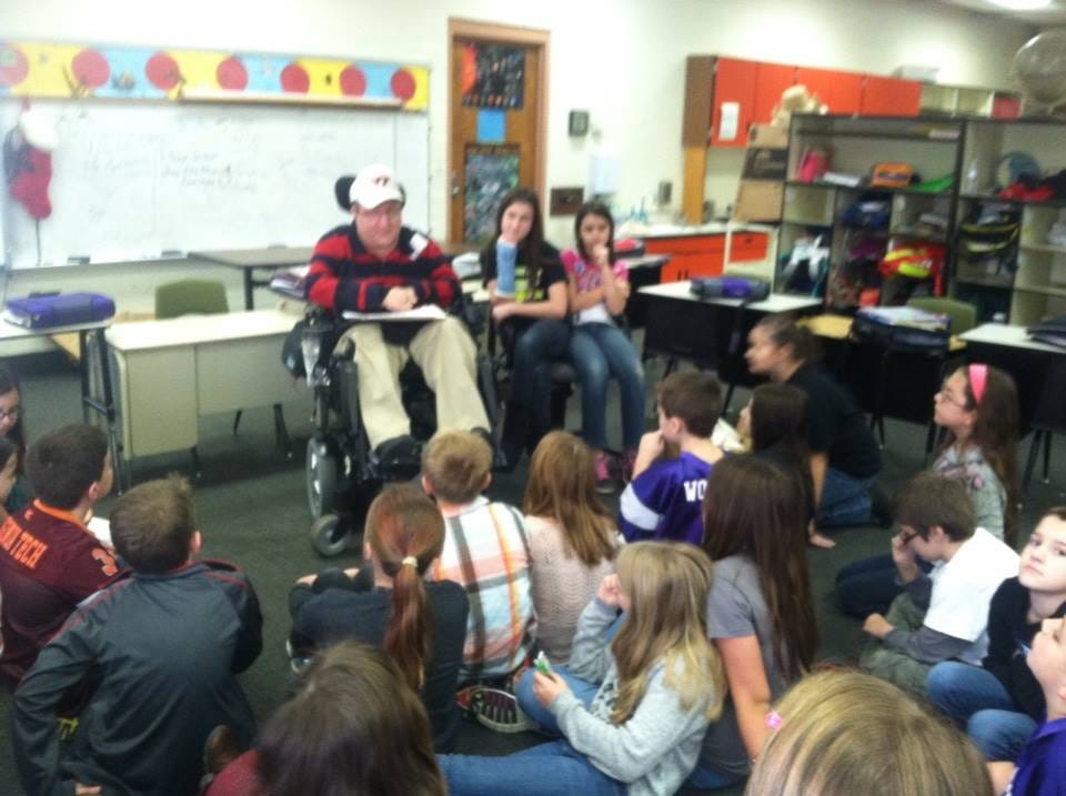 Greg, pictured above in his wheelchair, is seen teaching students in my classroom about how to respond to people with disabilities.